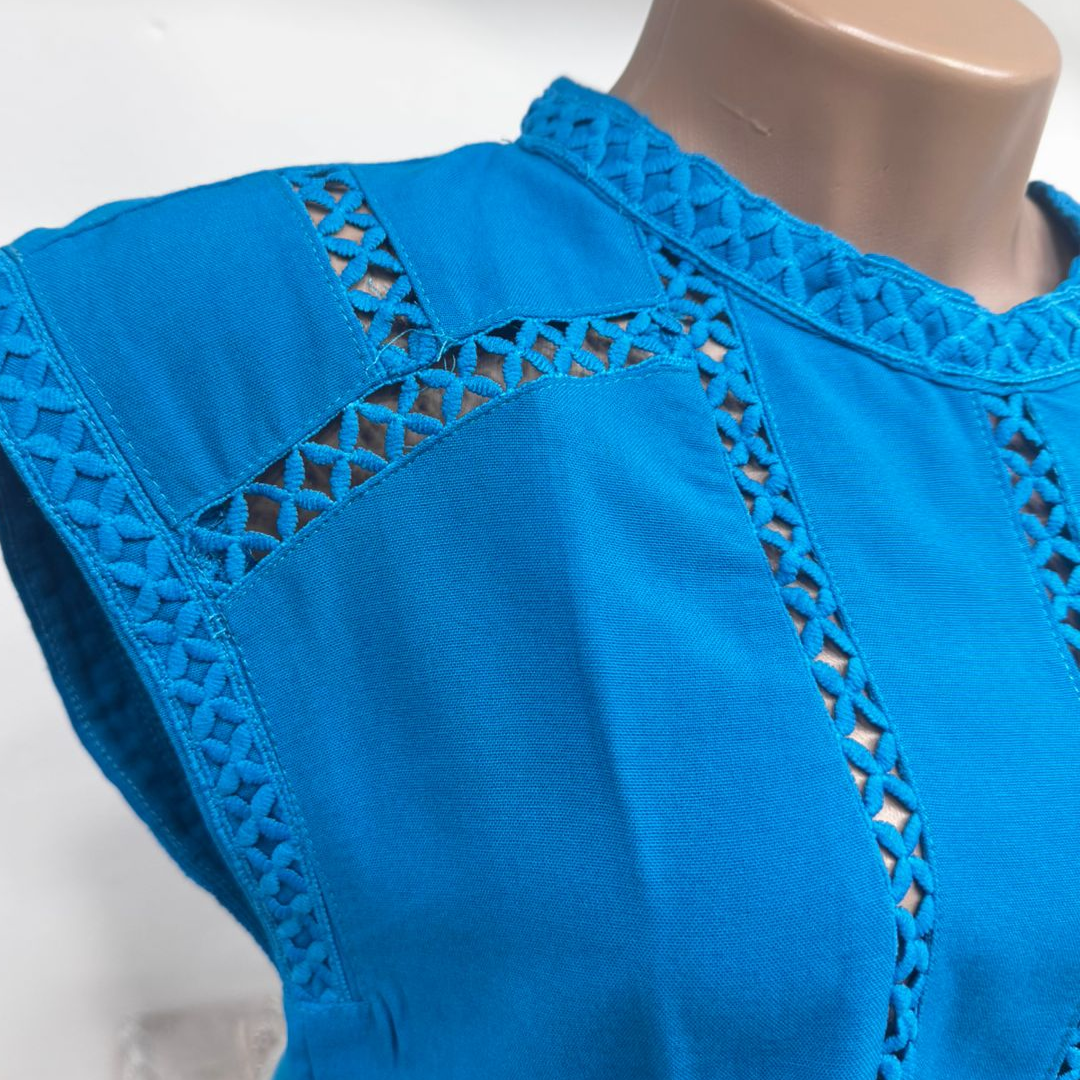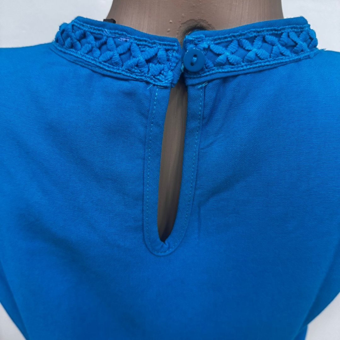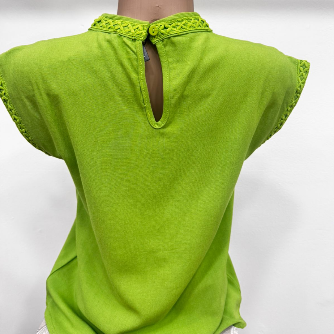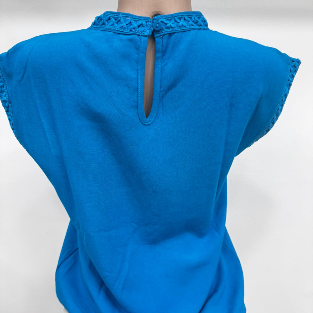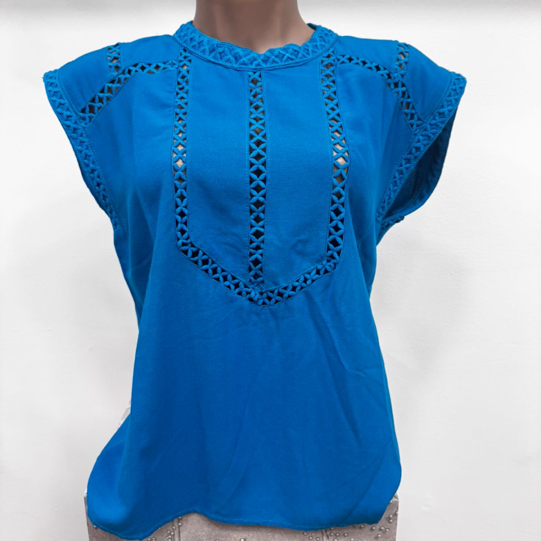 Luce fresca y elegante con esta blusa de viscosa suave al tacto, ideal para los días cálidos. Su diseño sin mangas y su corte relajado ofrecen comodidad y estilo a partes iguales. El detalle distintivo de esta prenda es el bordado calado en forma geométrica, que adorna el frente, los hombros y el cuello, aportando un toque artesanal y sofisticado.